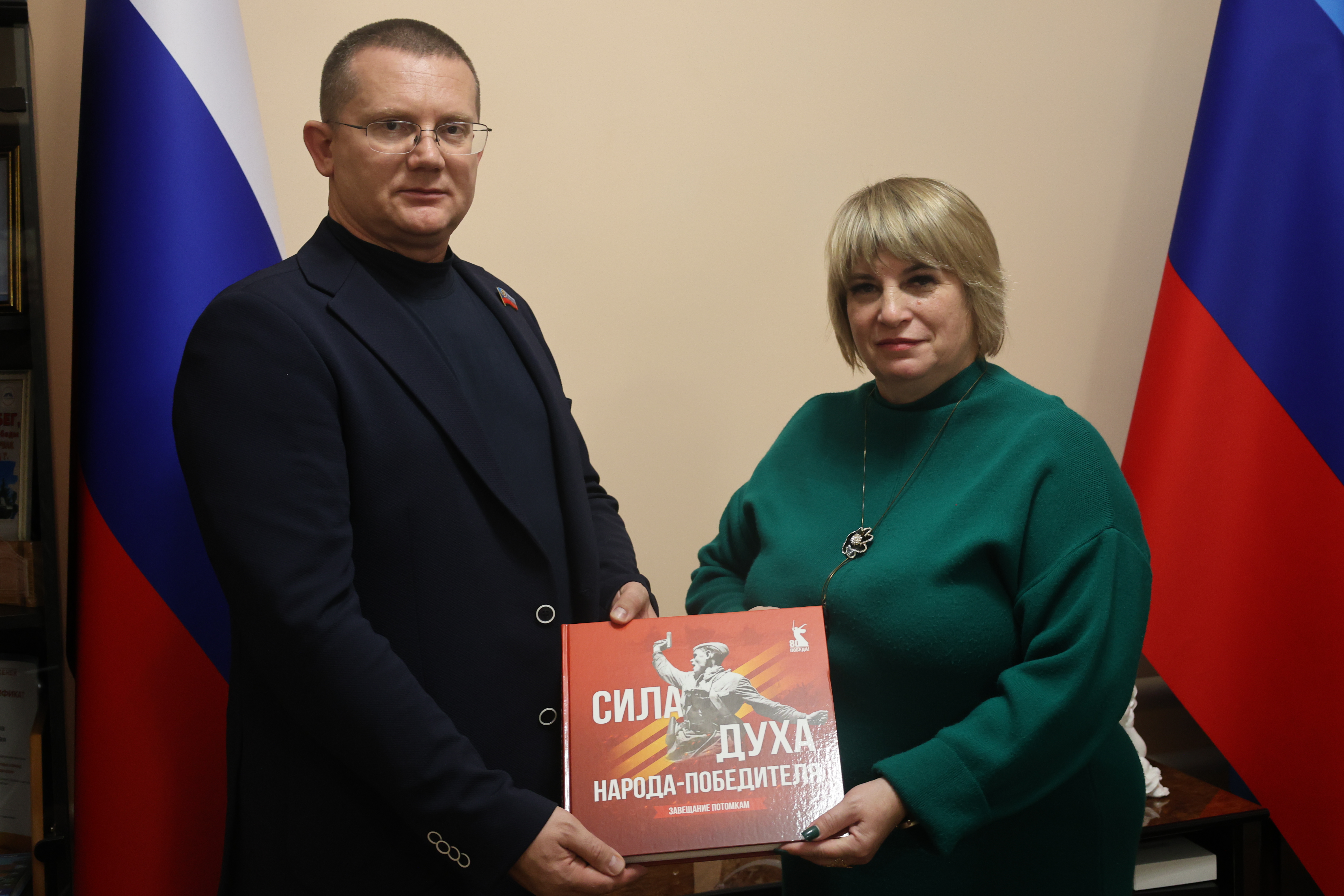 в Народном Совете ЛНР Геннадий Тараканов выполнил почетную миссию и вручил книгу партийного проекта "СИЛА ДУХА НАРОДА-ПОБЕДИТЕЛЯ" Главе округа Ольге Кучерявой