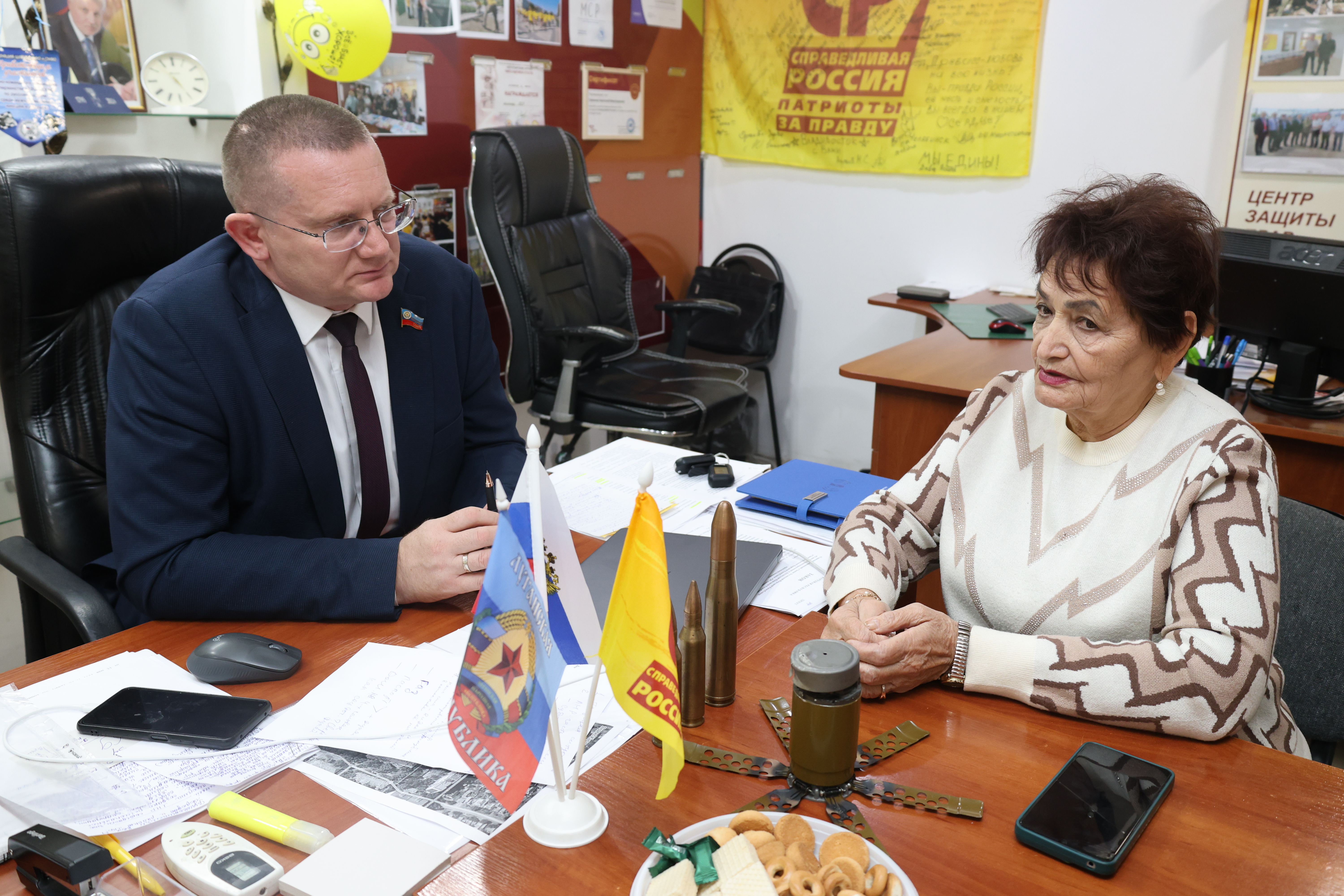На днях Руководитель фракции "СПРАВЕДЛИВАЯ РОССИЯ-ПАТРИОТЫ-ЗА ПРАВДУ" в Народном Совете Луганской Народной Республики Геннадий Тараканов встретился с членом Наблюдательного Совета Государственного Фонда "Защитники Отечества" при Президенте Российской Федерации Ниной Пшеничкиной