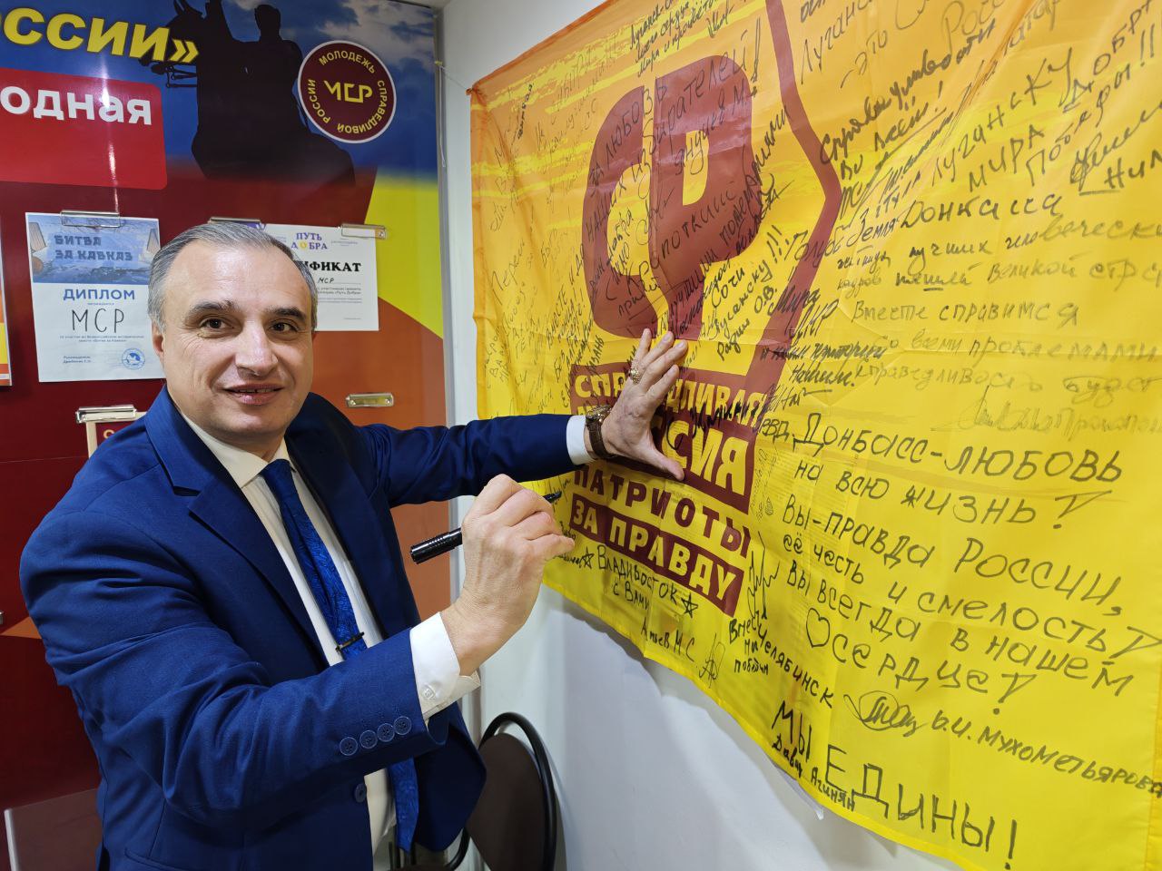 Руководитель фракции СПРАВЕДЛИВАЯ РОССИЯ в Народном Совете ЛНР Геннадий Тараканов пообщался с гостем и далее Арсен Клинчаев оставил на партийном флаге пожелание.