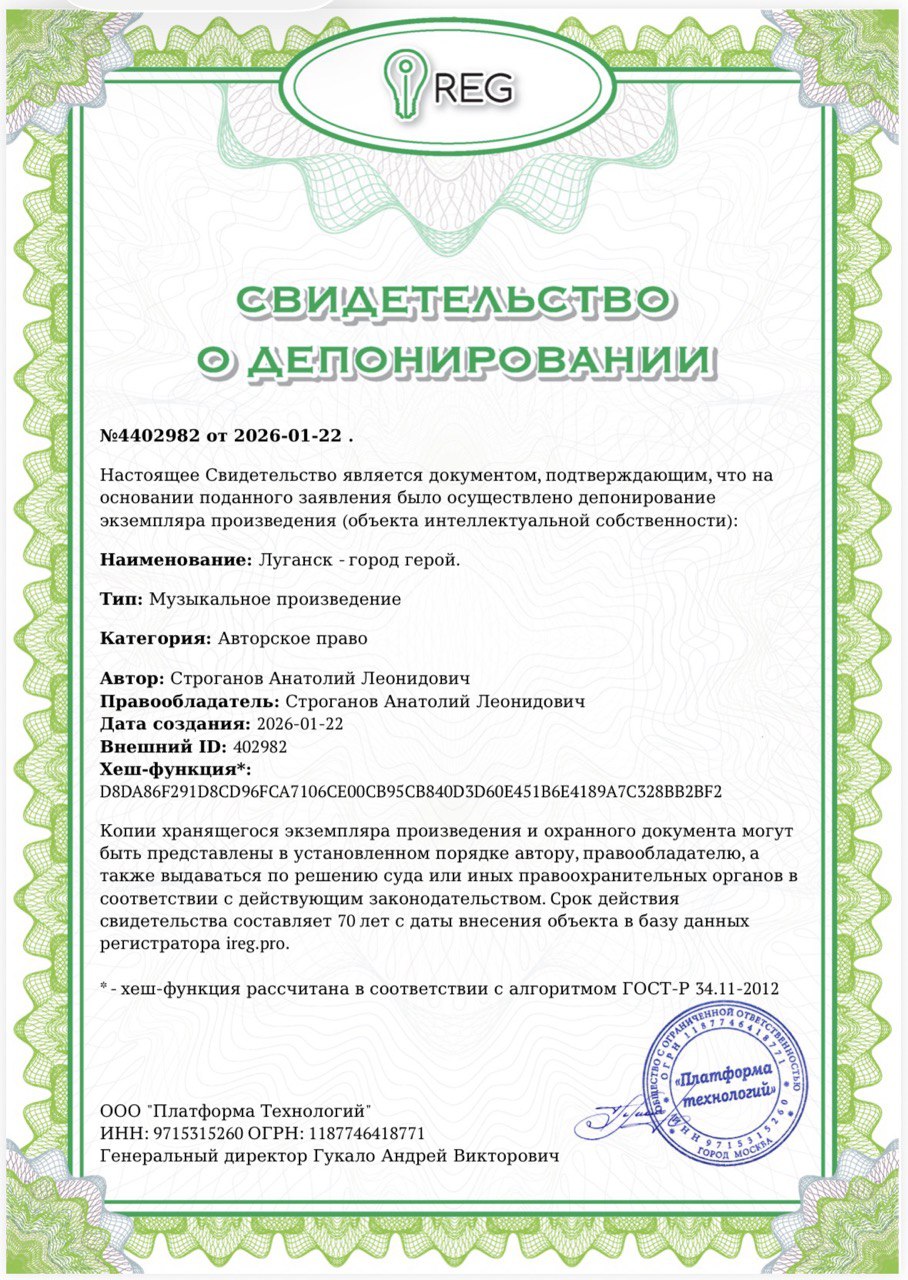 - "Это дно из лучших моих произведений. Дань чести городу Луганску. В песне каждое слово продумано до мелочей. Слова полностью мои. Получены авторские права на произведение. Песня зарегистрирована как положено и является объектом интеллектуальной собственности. Это мой подарок Луганску к 23 февраля – Дню Защитника Отечества. Всем хорошего прослушивания",